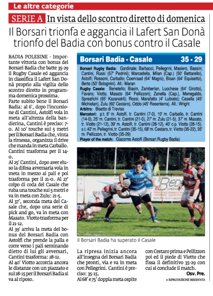 Rassegna stampa: Cronaca Borsari Badia v Casale Il Gazzettino