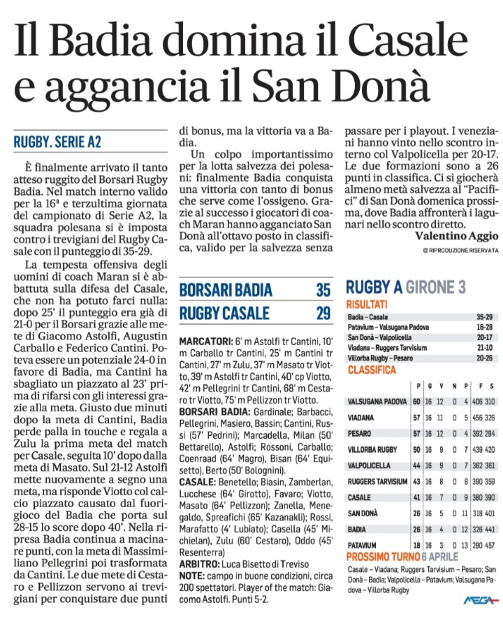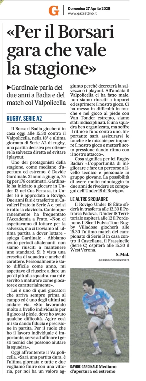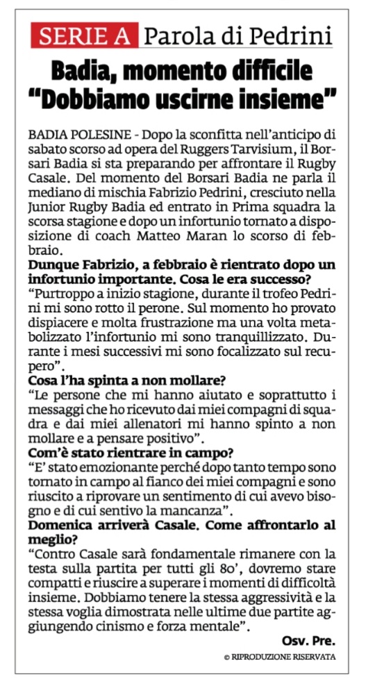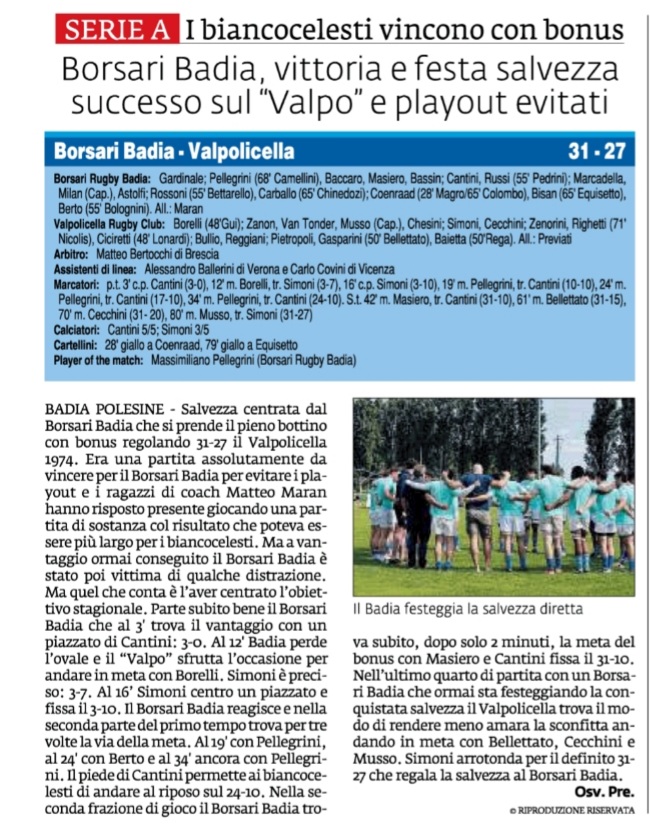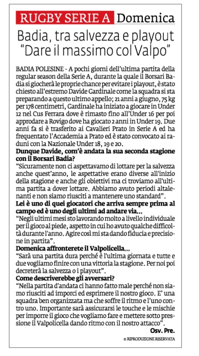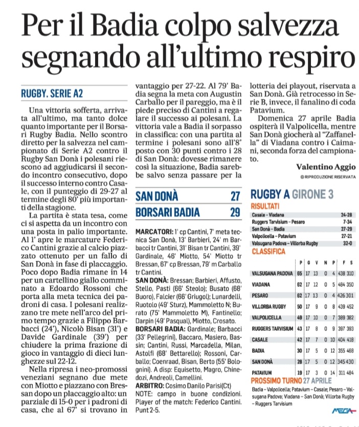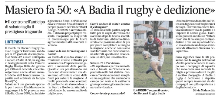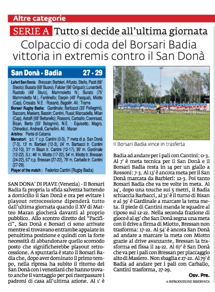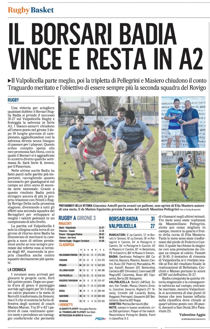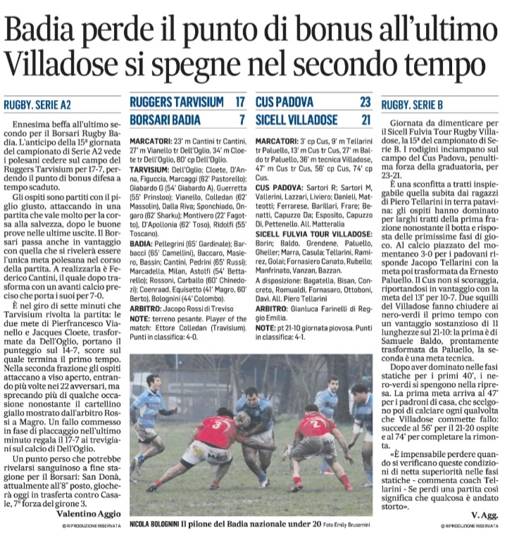 Rassegna stampa: Formazione Borsari Badia v Rugby San Donà La Voce di Rovigo